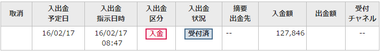今回は住信SBIネット銀行の手数料154円を引き、127,846円を入金してみました。